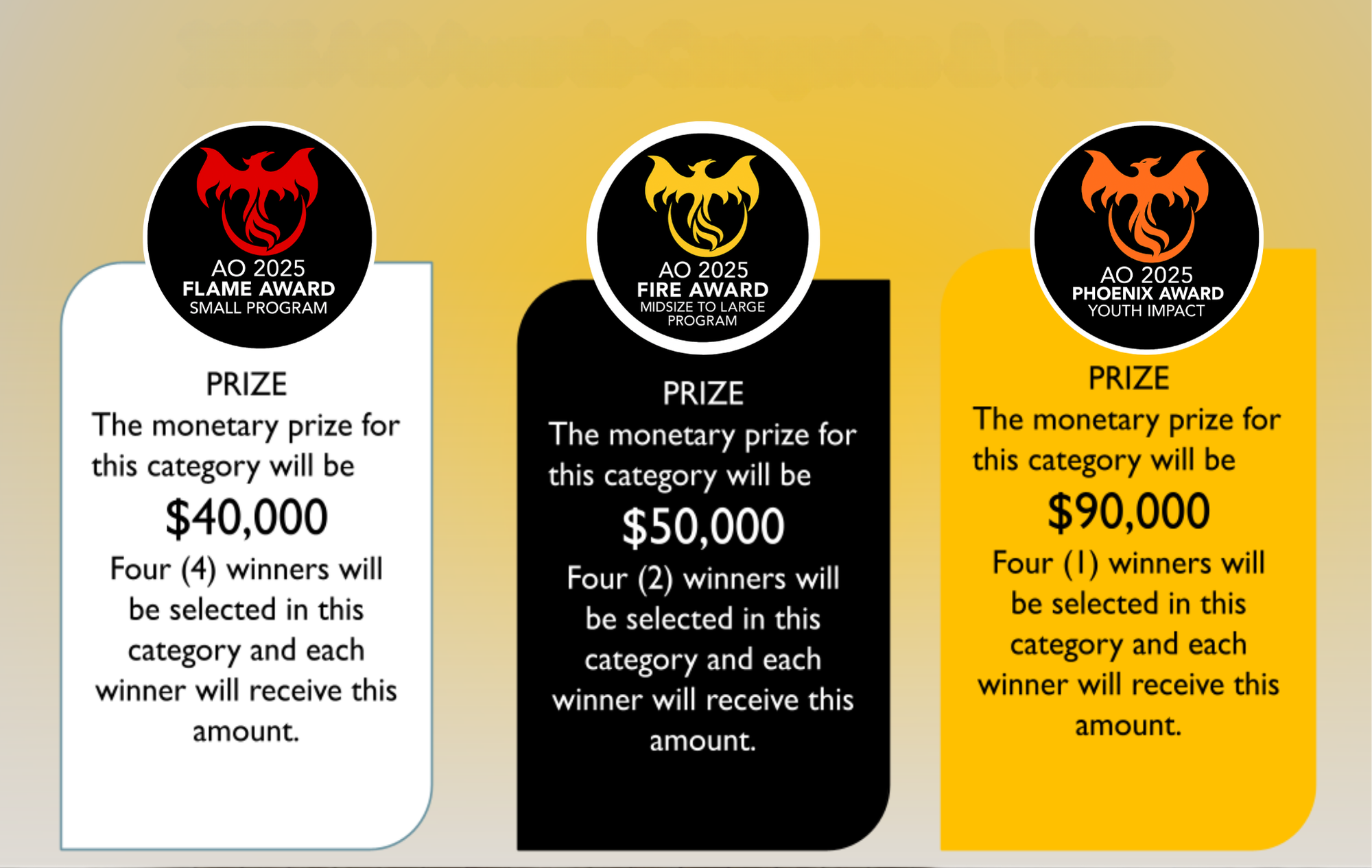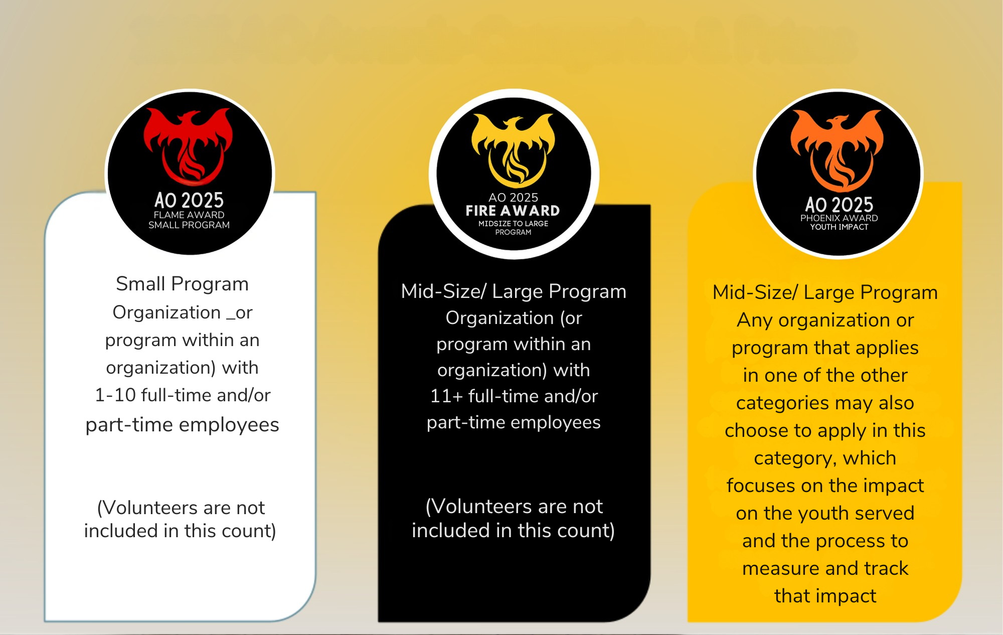We are again excited to be able to provide monetary prizes for the winners of our awards program! The amount for each program/organization size category was selected to be commensurate to general budget size. The larger amount for the Youth Impact category reflects the importance of applying strategies that actually make a difference in youths’ lives, as well as incorporating a solid process for identifying, measuring, and tracking the impact you are having.