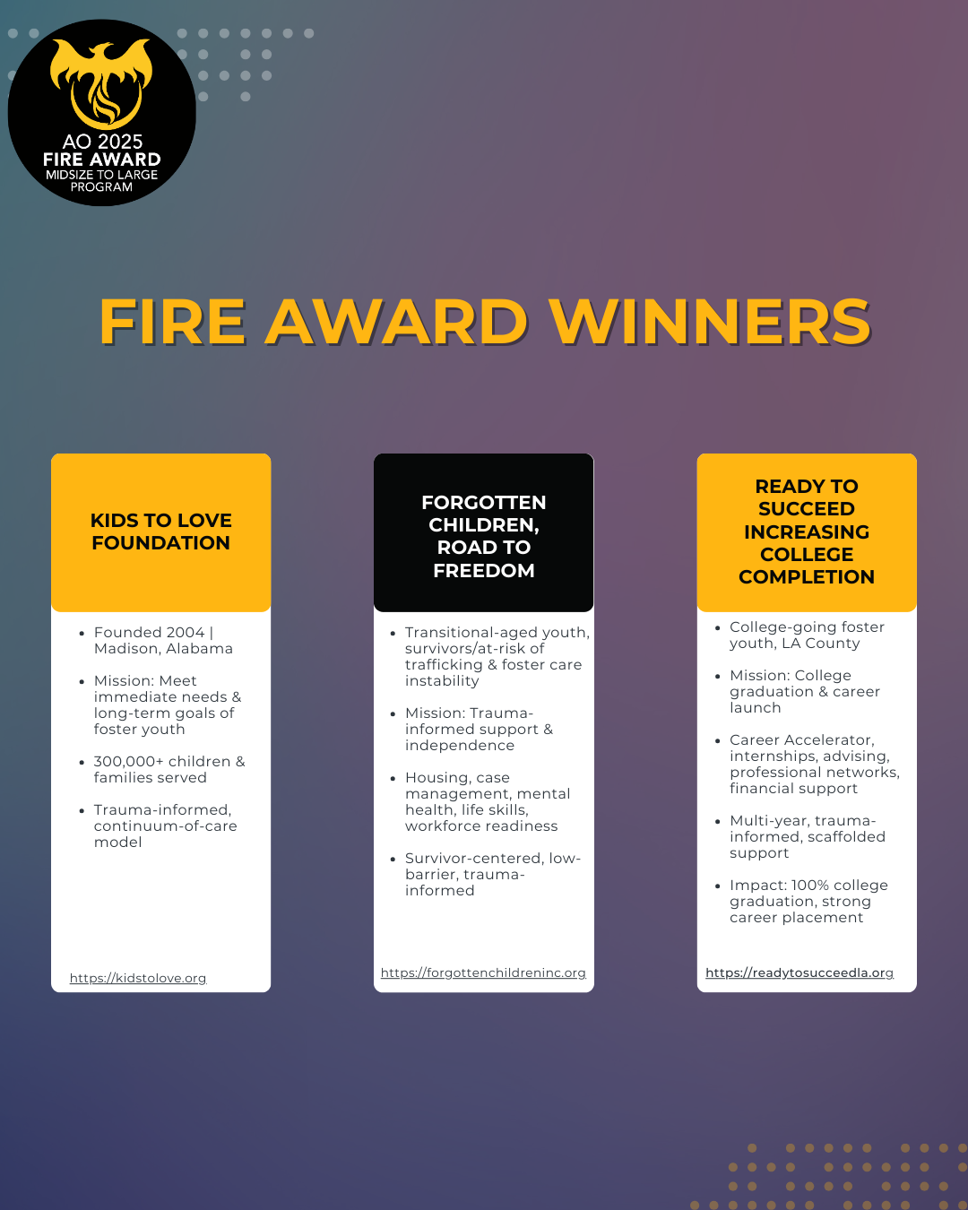 After a long thoughtful process, the judges have finalized the awardee list for the Flame, Fire, and Phoenix Awards. Each organization was chosen for their dedicated work in supporting justice impacted and foster youth across the nation!